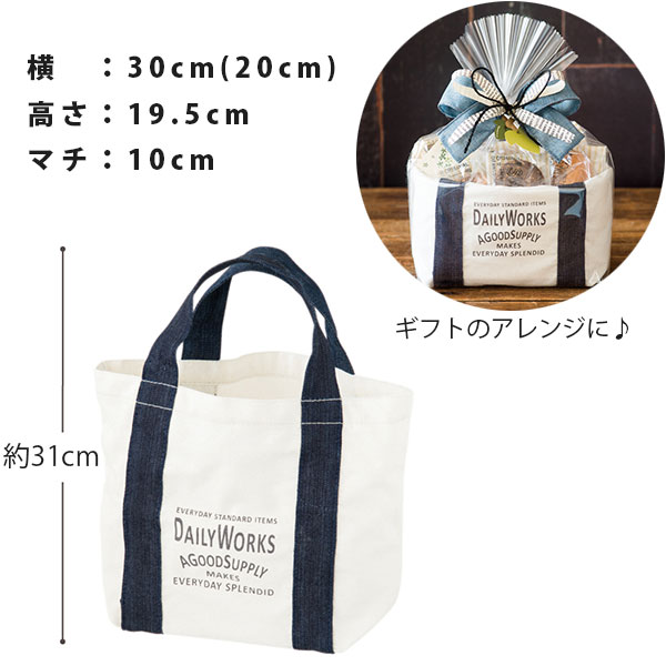 有料ラッピング対応ブランド:Daily Works デイリーワークス 商品名/品番:DW-SB 素材:ポリエステル綿 サイズ:W300(200)×H195×D100mm カラー 1.ホワイト/ネイビー 白色/紺色 デイリーワークスシリーズの、かっこいいデザインのトートバッグです。