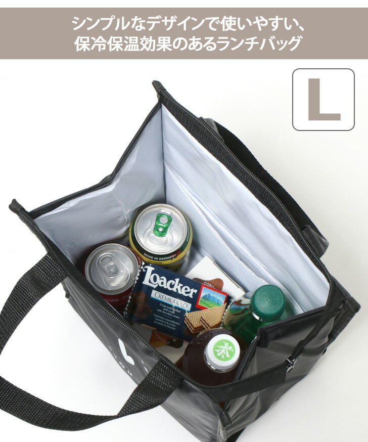 ●シンプルなデザインで使いやすい、保冷保温効果のあるランチバッグLサイズ 内側に保冷剤が収納できるメッシュポケット付き。